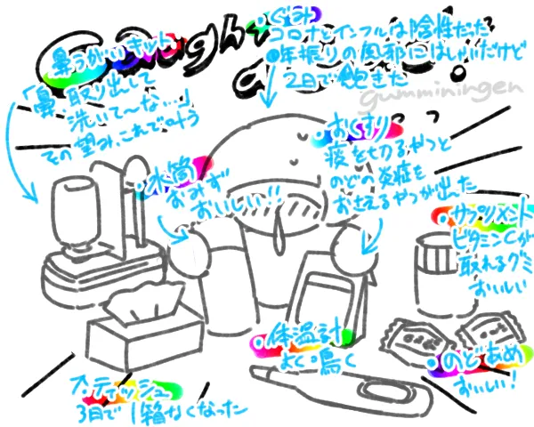 以降、ひたすら寝て時々起きて水分と栄養を取って……という感じなのだが、鼻うがいも欠かさずやっていた。これは習慣化しておいてよかったと思うことの一つである。意識が朦朧としていてもボトルを洗い、36度前後の湯を汲み、個包装化された塩を溶かし、作った洗浄液を鼻にぶち込むという動作がスムーズに行えるのは我ながら偉いと思う。もはや面倒くさくもなんともない。だって習慣だから。習慣って強いぜ。