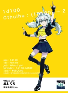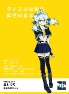 彼女が住んでいる世界は現代とは異なる場所であり、そこではすべてが乱数、つまり1d100で決まっている。LDCという舞台においても、彼女は1d100の呪いから逃れることはできない。 相棒のセグウェイ「ブラックダイヤモンドリリー号」のDEXの数値や、ロザリオ(※SIZ1d100)の故障No.も1d100で決定された。